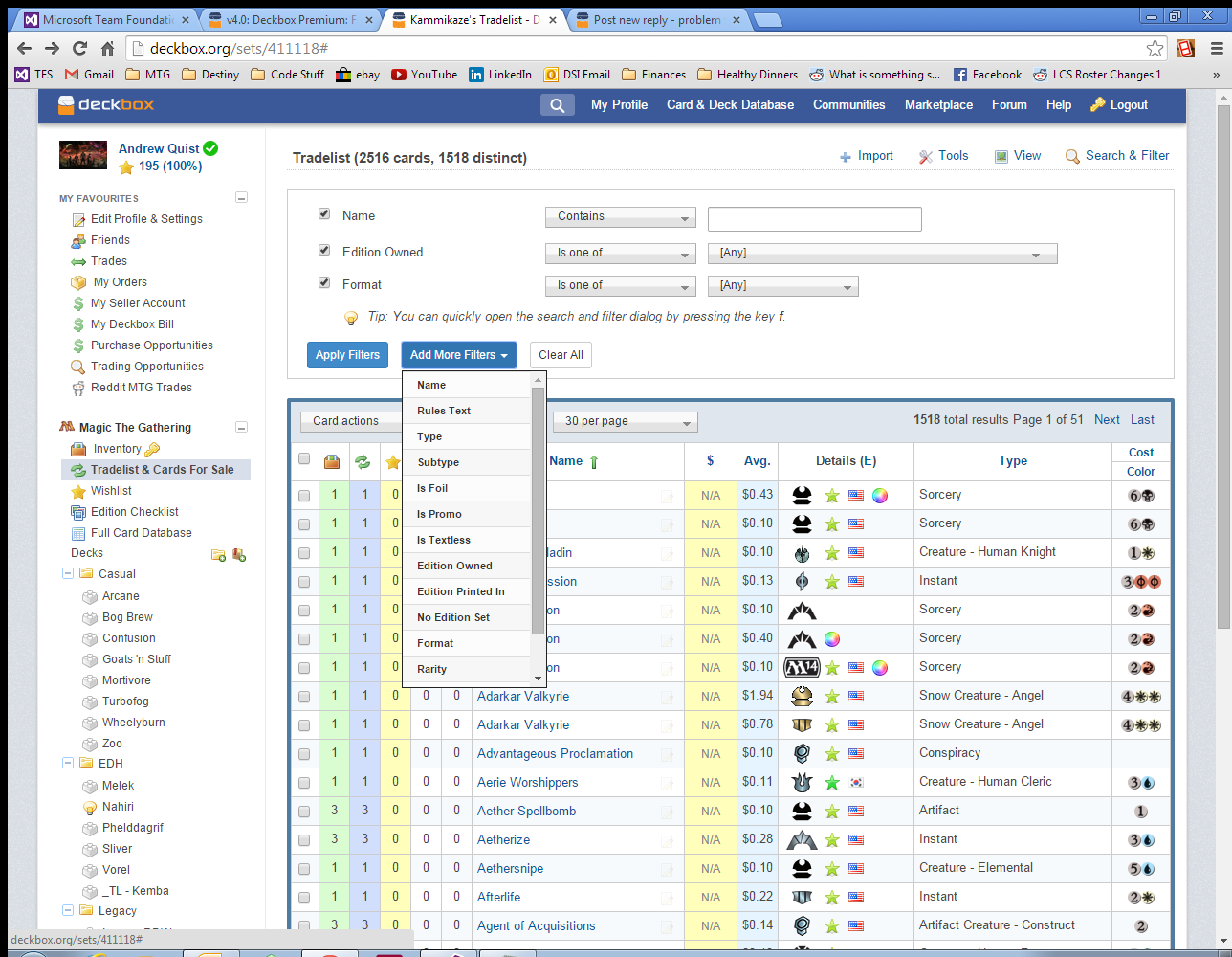 TreasureChest wrote:I was trying to have the ability in edition checklist to either show a particular rarity only or have it sort alphabetical by rarity. This would allow my store binders to be updated for price changes or check inventory counts easier.