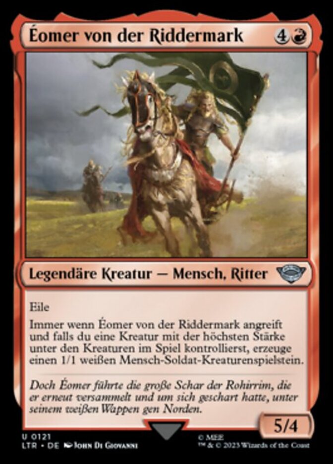 | Rules | Haste Whenever Éomer of the Riddermark attacks, if you control a creature with the greatest power among creatures on the battlefield, create a 1/1 white Human Soldier creature token. |