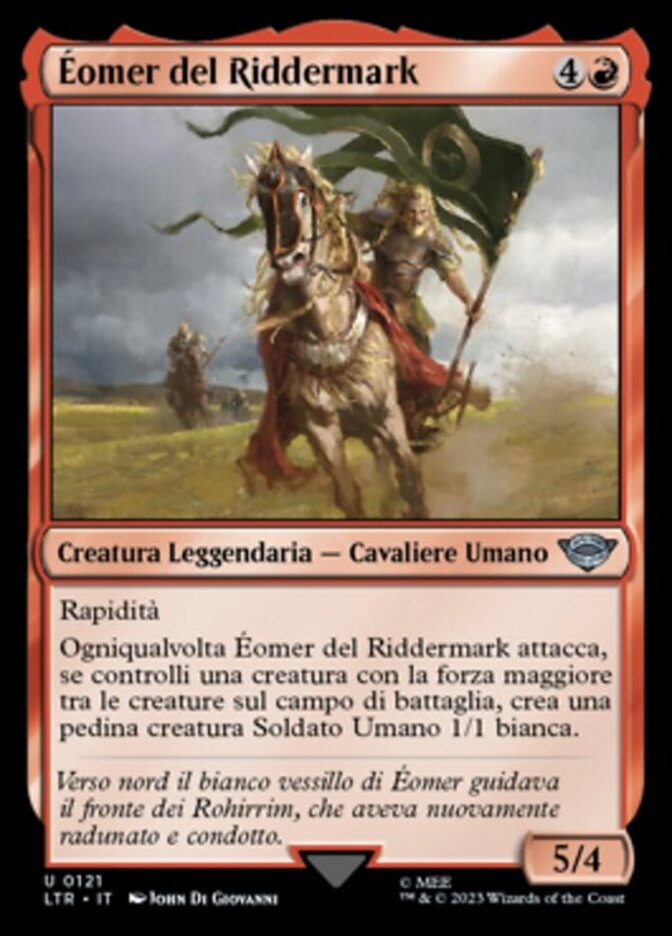 | Rules | Haste Whenever Éomer of the Riddermark attacks, if you control a creature with the greatest power among creatures on the battlefield, create a 1/1 white Human Soldier creature token. |