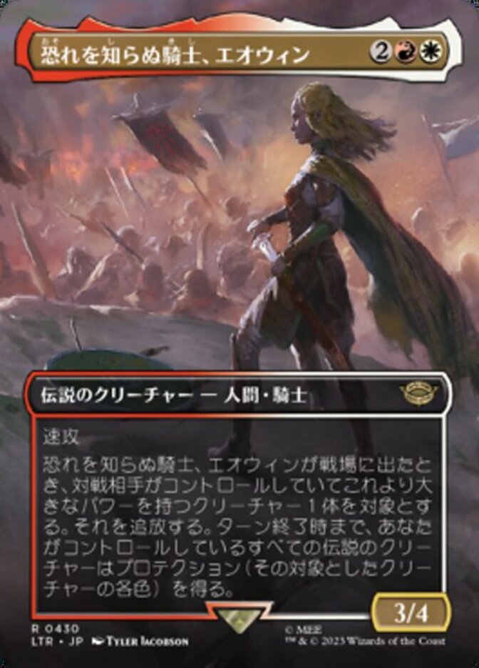 | Rules | Haste When Éowyn, Fearless Knight enters the battlefield, exile target creature an opponent controls with greater power. Legendary creatures you control gain protection from each of that creature's colors until end of turn. |