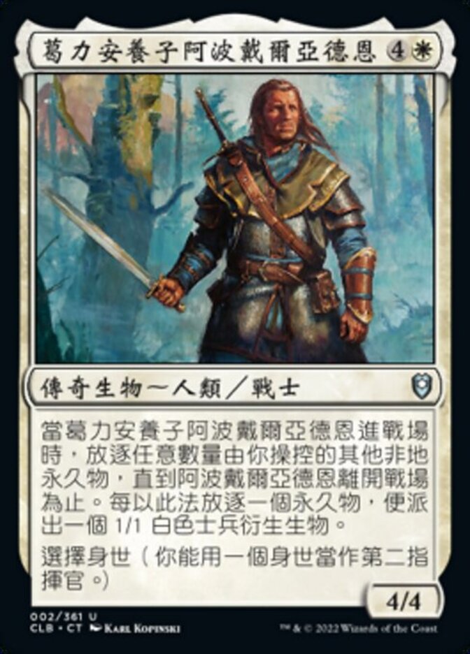 | Rules | When Abdel Adrian, Gorion's Ward enters the battlefield, exile any number of other nonland permanents you control until Abdel Adrian leaves the battlefield. Create a 1/1 white Soldier creature token for each permanent exiled this way. Choose a Background (You can have a Background as a second commander.) |