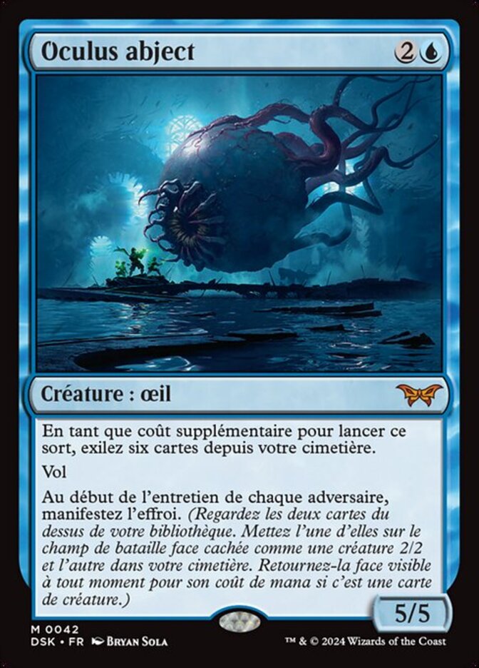 | Rules | As an additional cost to cast this spell, exile six cards from your graveyard. Flying At the beginning of each opponent's upkeep, manifest dread. (Look at the top two cards of your library. Put one onto the battlefield face down as a 2/2 creature and the other into your graveyard. Turn it face up any time for its mana cost if it's a creature card.) |