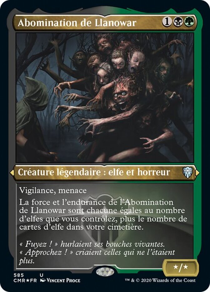| Rules | Vigilance; menace (This creature can't be blocked except by two or more creatures.) Abomination of Llanowar's power and toughness are each equal to the number of Elves you control plus the number of Elf cards in your graveyard. |