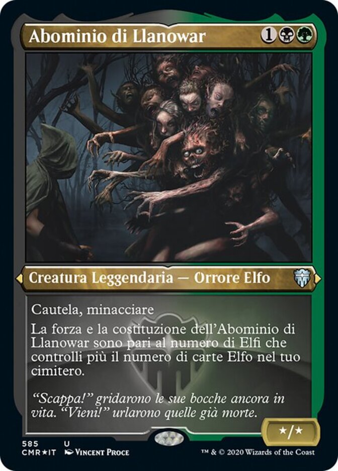 | Rules | Vigilance; menace (This creature can't be blocked except by two or more creatures.) Abomination of Llanowar's power and toughness are each equal to the number of Elves you control plus the number of Elf cards in your graveyard. |