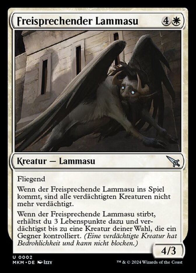 | Rules | Flying When Absolving Lammasu enters the battlefield, all suspected creatures are no longer suspected. When Absolving Lammasu dies, you gain 3 life and suspect up to one target creature an opponent controls. (A suspected creature has menace and can't block.) |