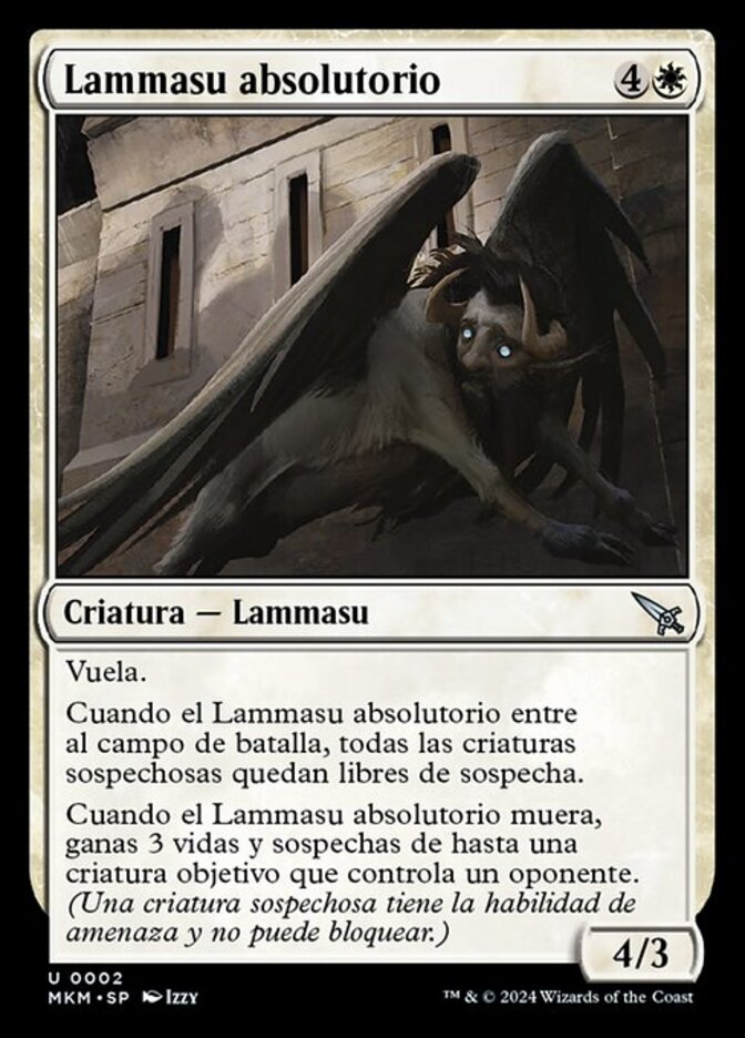 | Rules | Flying When Absolving Lammasu enters the battlefield, all suspected creatures are no longer suspected. When Absolving Lammasu dies, you gain 3 life and suspect up to one target creature an opponent controls. (A suspected creature has menace and can't block.) |