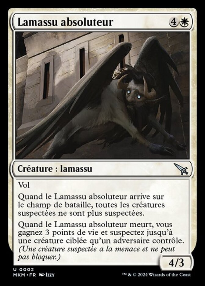 | Rules | Flying When Absolving Lammasu enters the battlefield, all suspected creatures are no longer suspected. When Absolving Lammasu dies, you gain 3 life and suspect up to one target creature an opponent controls. (A suspected creature has menace and can't block.) |