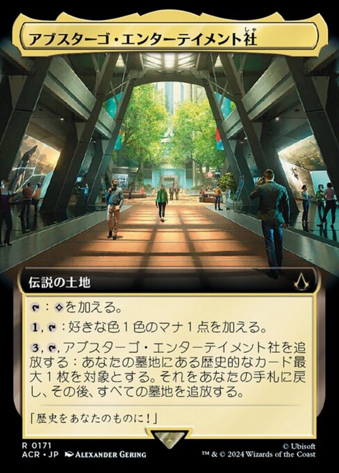 | Rules | : Add . , : Add one mana of any color. , , Exile Abstergo Entertainment: Return up to one target historic card from your graveyard to your hand, then exile all graveyards. (Artifacts, legendaries, and Sagas are historic.) |