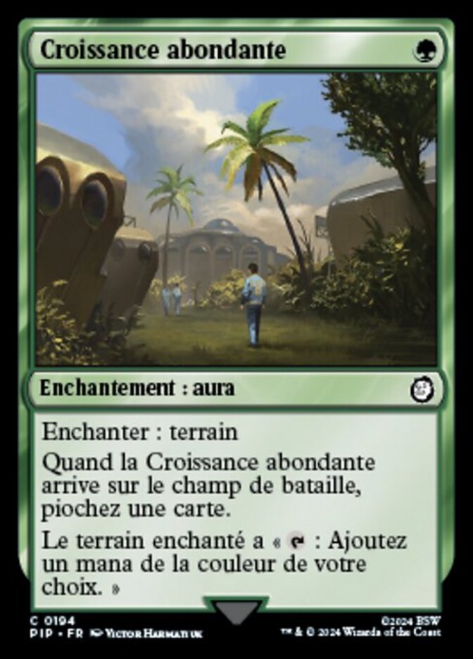 | Rules | Enchant land When Abundant Growth enters the battlefield, draw a card. Enchanted land has ": Add one mana of any color." |