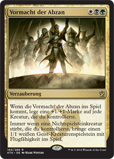 | Rules | When Abzan Ascendancy enters the battlefield, put a +1/+1 counter on each creature you control. Whenever a nontoken creature you control dies, create a 1/1 white Spirit creature token with flying. |