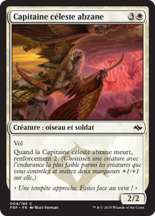 | Rules | Flying When Abzan Skycaptain dies, bolster 2. (Choose a creature with the least toughness among creatures you control and put two +1/+1 counters on it.) |
