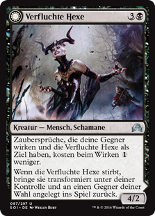 | Rules | Spells your opponents cast that target Accursed Witch cost less to cast. When Accursed Witch dies, return it to the battlefield transformed under your control attached to target opponent. // Enchant player Spells you cast that target enchanted player cost less to cast. At the beginning of enchanted player's upkeep, that player loses 1 life and you gain 1 life. |