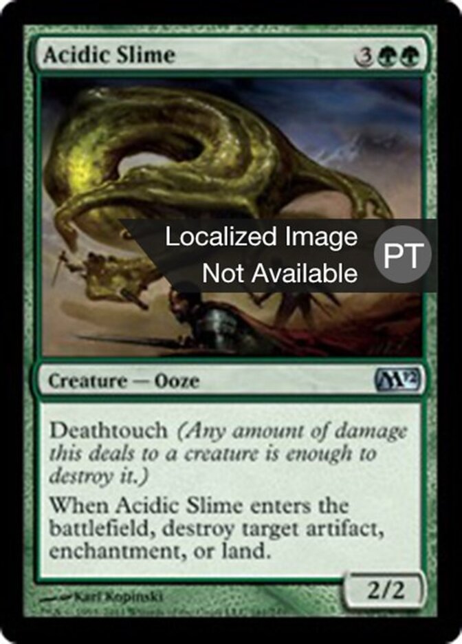 | Rules | Deathtouch (Any amount of damage this deals to a creature is enough to destroy it.) When Acidic Slime enters the battlefield, destroy target artifact, enchantment, or land. |