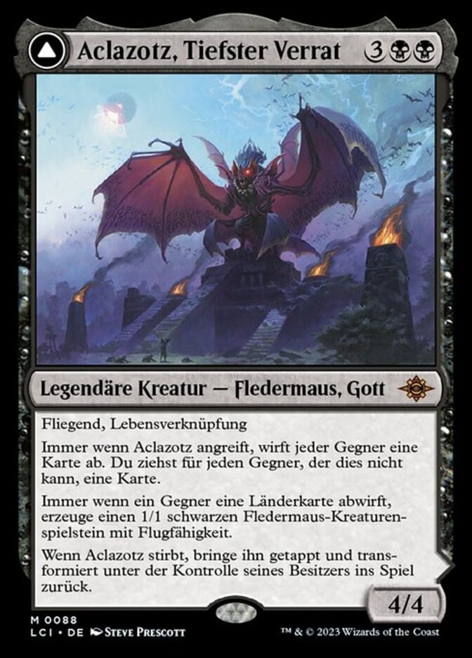 | Rules | Flying, lifelink Whenever Aclazotz attacks, each opponent discards a card. For each opponent who can't, you draw a card. Whenever an opponent discards a land card, create a 1/1 black Bat creature token with flying. When Aclazotz dies, return it to the battlefield tapped and transformed under its owner's control. // (Transforms from Aclazotz, Deepest Betrayal.) : Add . , : Transform Temple of the Dead. Activate only if a player has one or fewer cards in hand and only as a sorcery. |