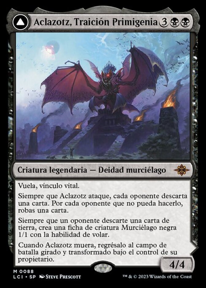 | Rules | Flying, lifelink Whenever Aclazotz attacks, each opponent discards a card. For each opponent who can't, you draw a card. Whenever an opponent discards a land card, create a 1/1 black Bat creature token with flying. When Aclazotz dies, return it to the battlefield tapped and transformed under its owner's control. // (Transforms from Aclazotz, Deepest Betrayal.) : Add . , : Transform Temple of the Dead. Activate only if a player has one or fewer cards in hand and only as a sorcery. |