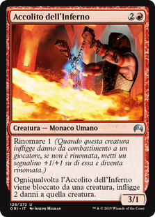 | Rules | Renown 1 (When this creature deals combat damage to a player, if it isn't renowned, put a +1/+1 counter on it and it becomes renowned.) Whenever Acolyte of the Inferno becomes blocked by a creature, it deals 2 damage to that creature. |