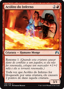 | Rules | Renown 1 (When this creature deals combat damage to a player, if it isn't renowned, put a +1/+1 counter on it and it becomes renowned.) Whenever Acolyte of the Inferno becomes blocked by a creature, it deals 2 damage to that creature. |