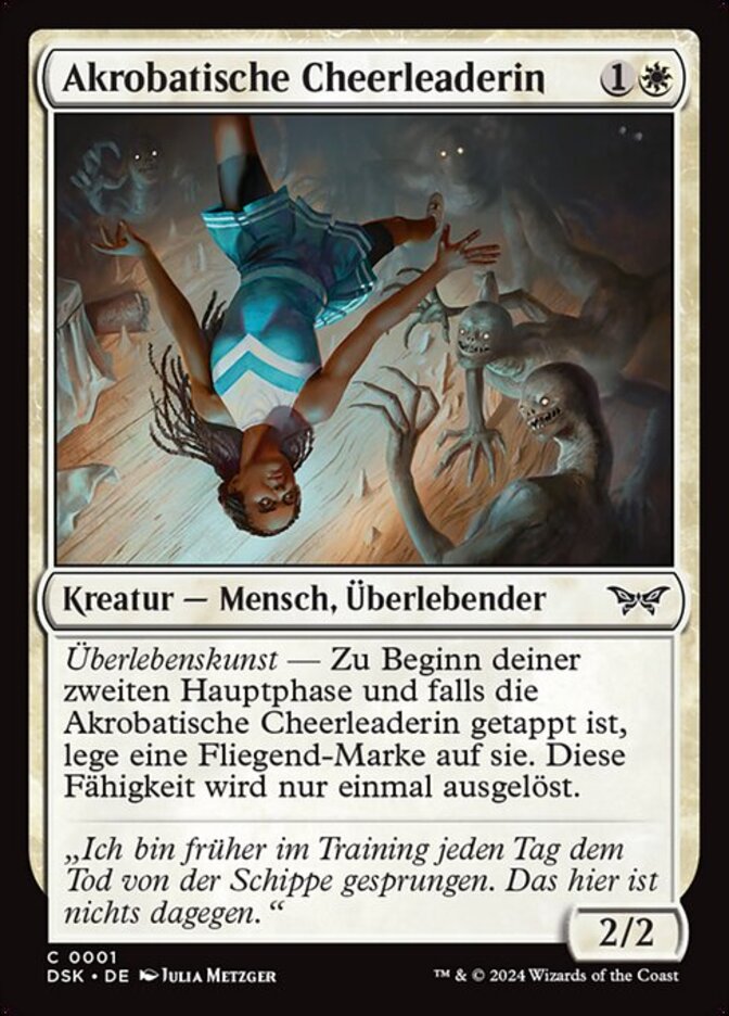 | Rules | Survival — At the beginning of your second main phase, if Acrobatic Cheerleader is tapped, put a flying counter on it. This ability triggers only once. |