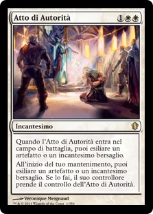 | Rules | When Act of Authority enters the battlefield, you may exile target artifact or enchantment. At the beginning of your upkeep, you may exile target artifact or enchantment. If you do, its controller gains control of Act of Authority. |