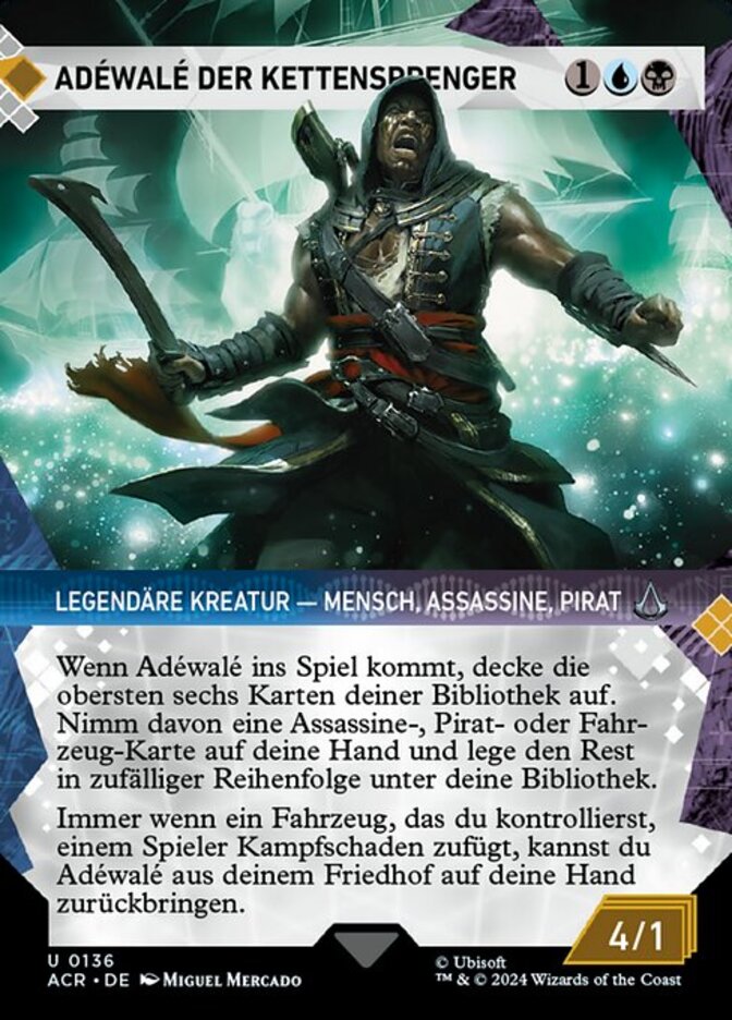 | Rules | When Adéwalé enters the battlefield, reveal the top six cards of your library. Put an Assassin, Pirate, or Vehicle card from among them into your hand and the rest on the bottom of your library in a random order. Whenever a Vehicle you control deals combat damage to a player, you may return Adéwalé from your graveyard to your hand. |