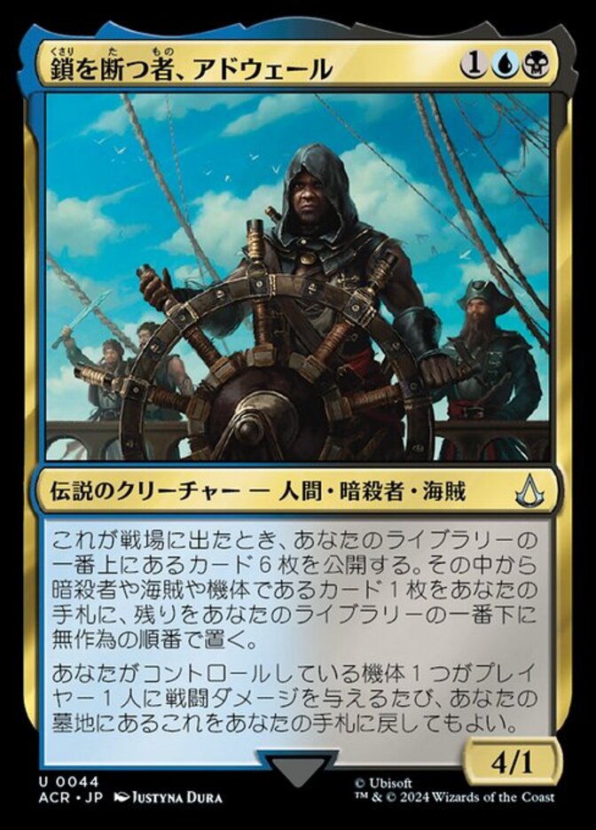| Rules | When Adéwalé enters the battlefield, reveal the top six cards of your library. Put an Assassin, Pirate, or Vehicle card from among them into your hand and the rest on the bottom of your library in a random order. Whenever a Vehicle you control deals combat damage to a player, you may return Adéwalé from your graveyard to your hand. |