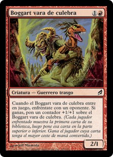 | Rules | When Adder-Staff Boggart enters the battlefield, clash with an opponent. If you win, put a +1/+1 counter on Adder-Staff Boggart. (Each clashing player reveals the top card of their library, then puts that card on the top or bottom. A player wins if their card had a higher mana value.) |