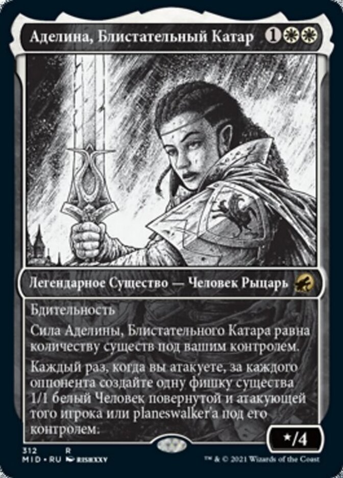 | Rules | Vigilance Adeline, Resplendent Cathar's power is equal to the number of creatures you control. Whenever you attack, for each opponent, create a 1/1 white Human creature token that's tapped and attacking that player or a planeswalker they control. |