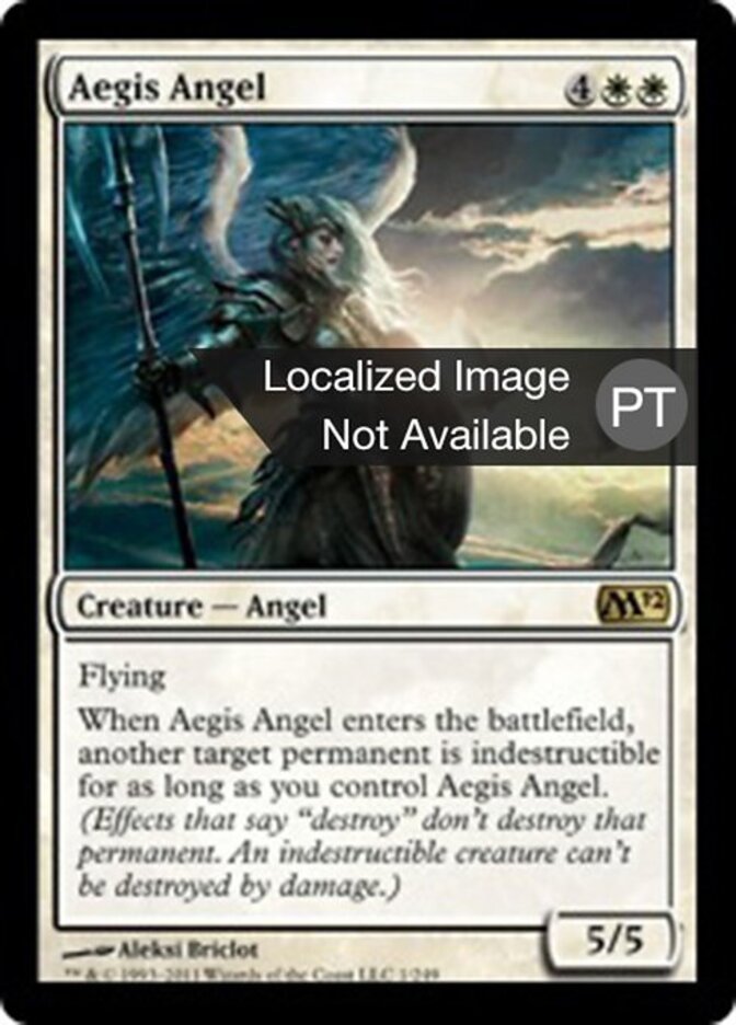 | Rules | Flying (This creature can't be blocked except by creatures with flying or reach.) When Aegis Angel enters the battlefield, another target permanent gains indestructible for as long as you control Aegis Angel. (Effects that say "destroy" don't destroy it. A creature with indestructible can't be destroyed by damage.) |