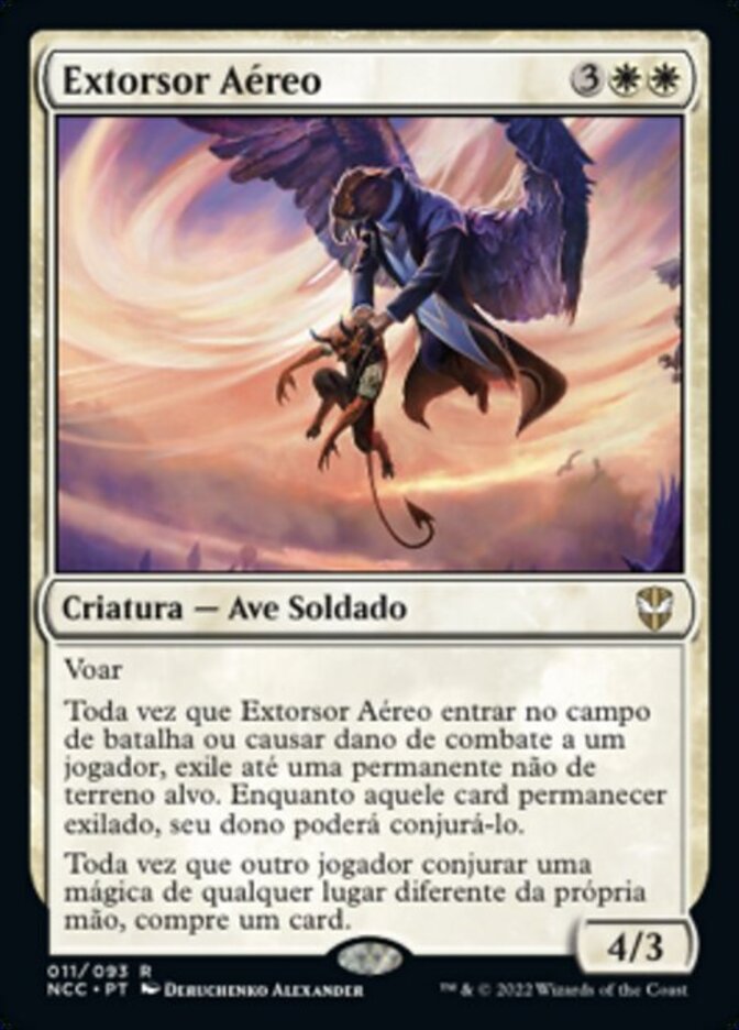 | Rules | Flying Whenever Aerial Extortionist enters the battlefield or deals combat damage to a player, exile up to one target nonland permanent. For as long as that card remains exiled, its owner may cast it. Whenever another player casts a spell from anywhere other than their hand, draw a card. |