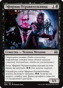 | Rules | Deathtouch (Any amount of damage this deals to a creature is enough to destroy it.) When Aether Poisoner enters the battlefield, you get (two energy counters). Whenever Aether Poisoner attacks, you may pay . If you do, create a 1/1 colorless Servo artifact creature token. |