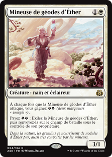| Rules | Whenever Aethergeode Miner attacks, you get (two energy counters). Pay : Exile Aethergeode Miner, then return it to the battlefield under its owner's control. |