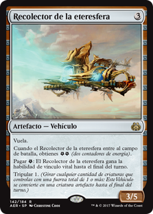 | Rules | Flying When Aethersphere Harvester enters the battlefield, you get (two energy counters). Pay : Aethersphere Harvester gains lifelink until end of turn. Crew 1 (Tap any number of creatures you control with total power 1 or more: This Vehicle becomes an artifact creature until end of turn.) |