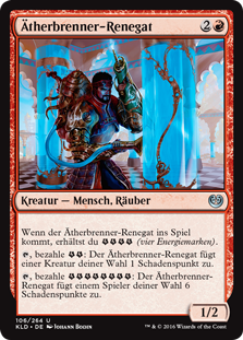 | Rules | When Aethertorch Renegade enters the battlefield, you get (four energy counters). , Pay : Aethertorch Renegade deals 1 damage to target creature. , Pay : Aethertorch Renegade deals 6 damage to target player or planeswalker. |