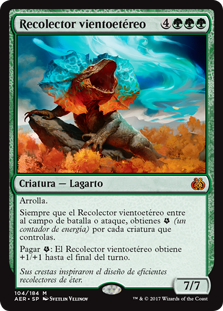 | Rules | Trample Whenever Aetherwind Basker enters the battlefield or attacks, you get (an energy counter) for each creature you control. Pay : Aetherwind Basker gets +1/+1 until end of turn. |