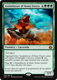 | Rules | Trample Whenever Aetherwind Basker enters the battlefield or attacks, you get (an energy counter) for each creature you control. Pay : Aetherwind Basker gets +1/+1 until end of turn. |