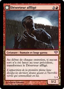 | Rules | At the beginning of each upkeep, if no spells were cast last turn, transform Afflicted Deserter. // Whenever this creature transforms into Werewolf Ransacker, you may destroy target artifact. If that artifact is put into a graveyard this way, Werewolf Ransacker deals 3 damage to that artifact's controller. At the beginning of each upkeep, if a player cast two or more spells last turn, transform Werewolf Ransacker. |