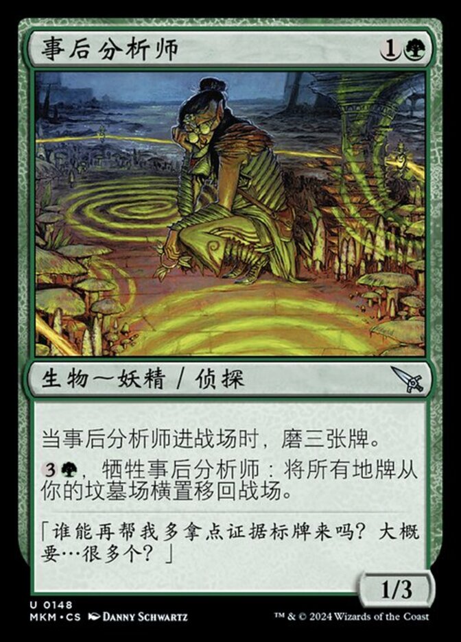 | Rules | When Aftermath Analyst enters the battlefield, mill three cards. , Sacrifice Aftermath Analyst: Return all land cards from your graveyard to the battlefield tapped. |