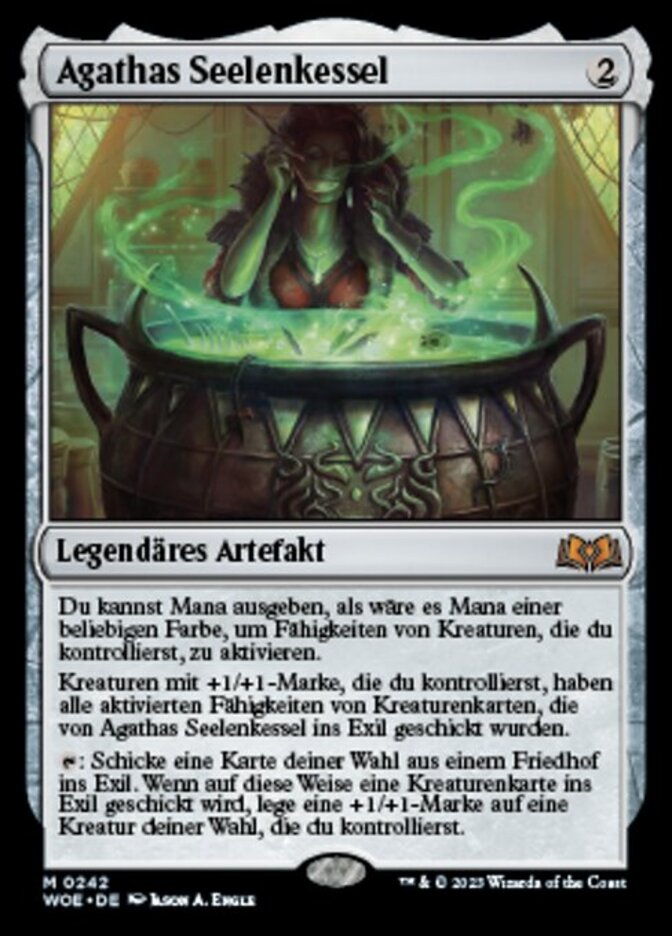 | Rules | You may spend mana as though it were mana of any color to activate abilities of creatures you control. Creatures you control with +1/+1 counters on them have all activated abilities of all creature cards exiled with Agatha's Soul Cauldron. : Exile target card from a graveyard. When a creature card is exiled this way, put a +1/+1 counter on target creature you control. |