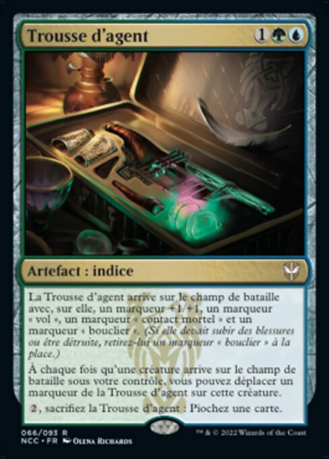 | Rules | Agent's Toolkit enters the battlefield with a +1/+1 counter, a flying counter, a deathtouch counter, and a shield counter on it. Whenever a creature enters the battlefield under your control, you may move a counter from Agent's Toolkit onto that creature. , Sacrifice Agent's Toolkit: Draw a card. |