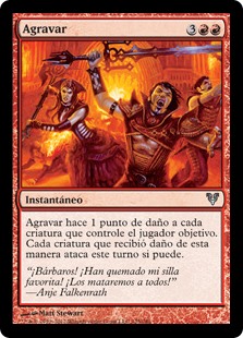| Rules | Aggravate deals 1 damage to each creature target player controls. Each creature dealt damage this way attacks this turn if able. |