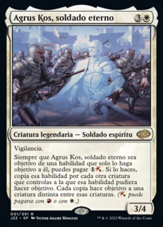 | Rules | Vigilance Whenever Agrus Kos, Eternal Soldier becomes the target of an ability that targets only it, you may pay . If you do, copy that ability for each other creature you control that ability could target. Each copy targets a different one of those creatures. ( can be paid with either or .) |
