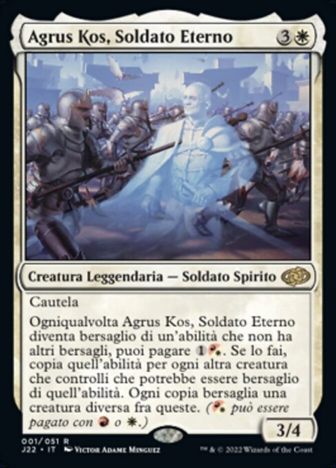 | Rules | Vigilance Whenever Agrus Kos, Eternal Soldier becomes the target of an ability that targets only it, you may pay . If you do, copy that ability for each other creature you control that ability could target. Each copy targets a different one of those creatures. ( can be paid with either or .) |