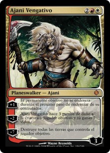 | Rules | +1: Target permanent doesn't untap during its controller's next untap step. −2: Ajani Vengeant deals 3 damage to any target and you gain 3 life. −7: Destroy all lands target player controls. |