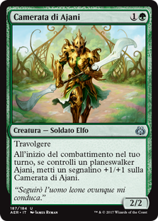 | Rules | Trample At the beginning of combat on your turn, if you control an Ajani planeswalker, put a +1/+1 counter on Ajani's Comrade. |