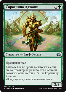 | Rules | Trample At the beginning of combat on your turn, if you control an Ajani planeswalker, put a +1/+1 counter on Ajani's Comrade. |