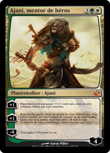 | Rules | +1: Distribute three +1/+1 counters among one, two, or three target creatures you control. +1: Look at the top four cards of your library. You may reveal an Aura, creature, or planeswalker card from among them and put it into your hand. Put the rest on the bottom of your library in any order. −8: You gain 100 life. |
