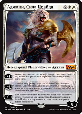 | Rules | +1: You gain life equal to the number of creatures you control plus the number of planeswalkers you control. −2: Create a 2/2 white Cat Soldier creature token named Ajani's Pridemate with "Whenever you gain life, put a +1/+1 counter on Ajani's Pridemate." 0: If you have at least 15 life more than your starting life total, exile Ajani, Strength of the Pride and each artifact and creature your opponents control. |