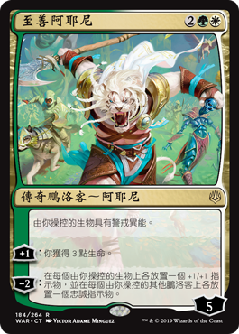 | Rules | Creatures you control have vigilance. +1: You gain 3 life. −2: Put a +1/+1 counter on each creature you control and a loyalty counter on each other planeswalker you control. |