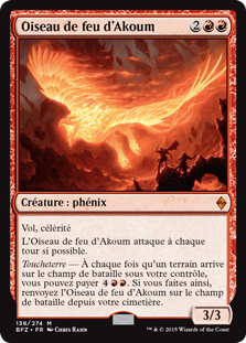 | Rules | Flying, haste Akoum Firebird attacks each combat if able. Landfall — Whenever a land enters the battlefield under your control, you may pay . If you do, return Akoum Firebird from your graveyard to the battlefield. |