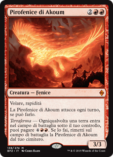 | Rules | Flying, haste Akoum Firebird attacks each combat if able. Landfall — Whenever a land enters the battlefield under your control, you may pay . If you do, return Akoum Firebird from your graveyard to the battlefield. |